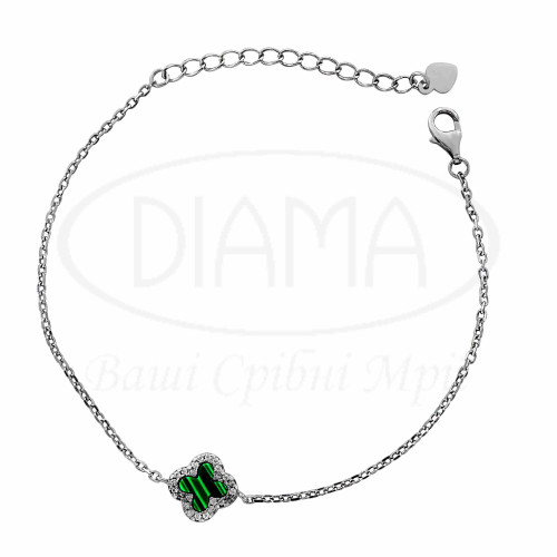 Срібний браслет з зеленим Малахітом. Срібло 925 проби, покрите родієм. Виготовлений в формі "Клевер". В наборі присутні сережки, каблучка, кольє, браслет та підвіс. Розмір головного елементу 10 мм.
