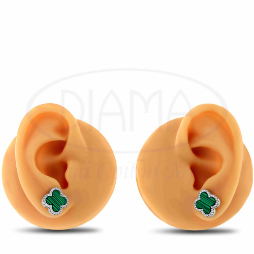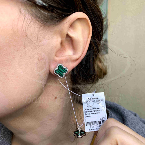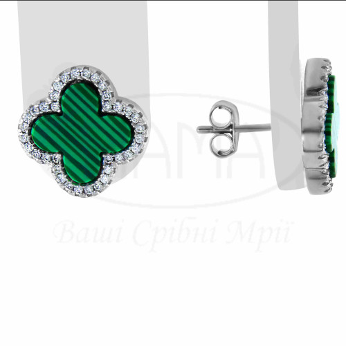 Сережки пусети срібні з Малахітом зеленим та білим цирконом. Срібло 925 проби, покрите родієм. Виготовлені в формі Конюшини. Розмір головного елементу - 14 мм.