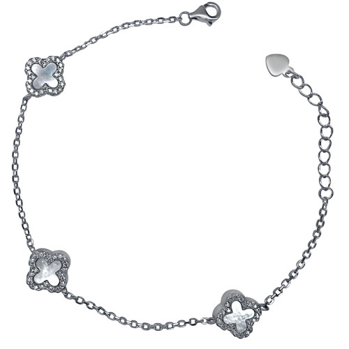 Срібний браслет з білим перламутром та білим цирконом. Срібло 925 проби, покритий родієм. Виготовлений в формі Конюшини. Браслет складається з 3 конюшин розміром 10 мм, відстань між ними 35 мм.