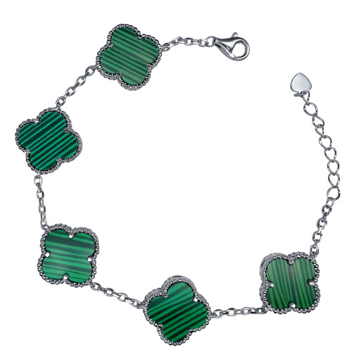 Срібний браслет з Малахітом. Срібло 925 проби, покрите родієм. Браслет виготовлений в формі "Клевер". В наборі присутні кольє та браслет. Розмір головних елементів - 14 мм, відстань між ними - 1,5 см.
