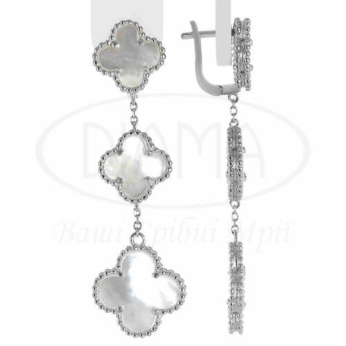 Срібні сережки з білим перламутром. Срібло 925 проби, покрите родієм. Сережки виготовлені в формі "Клевер". В наборі присутні кольє, сережки, підвіска та браслет.