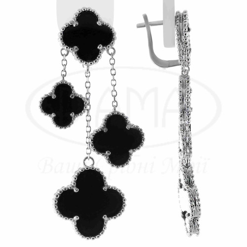 Срібні сережки з оніксом. Срібло 925 проби, покрите родієм. Сережки виготовлені в формі "Клевер". В наборі присутні кольє, сережки, підвіс та браслет. Розмір головних елементів - 18 мм, 15 мм та 11 мм.