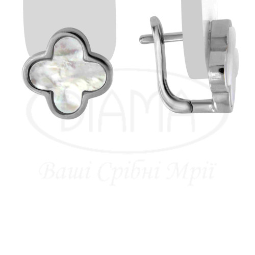 Срібні сережки з білим перламутром. Срібло 925 проби, покрите родієм. Сережки в формі "Клевер". Розмір головного елементу сережки 14 мм. В наборі присутні каблучка, підвіска та сережки.