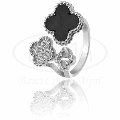 Каблучка потрійна срібна з Оніксом та білим цирконом. Срібло 925 проби, покрите родієм. Каблучка виготовлена формі "Клевер". В наборі присутні каблучка, сережки та підвіс.