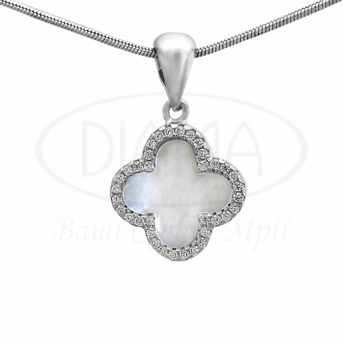 Підвіска срібна з білим перламутром та білим цирконом. Срібло 925 проби, покрите родієм. Підвіска виготовлена в формі "Клевер". В наборі присутні каблучка, підвіска та сережки.