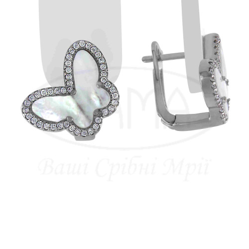 Сережки срібні з білим Перламутром та білим цирконом. Срібло 925 проби, покрите родієм. Розмір головного елементу 13х17 мм. Виготовлені в формі метелика.