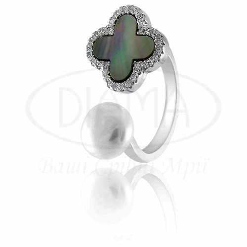 Срібна каблучка 925 проби, покрита родієм. Вставка чорний Перламутр, перлина та циркон. В наборі також присутні каблучка та сережки.