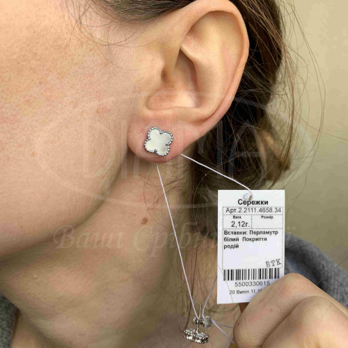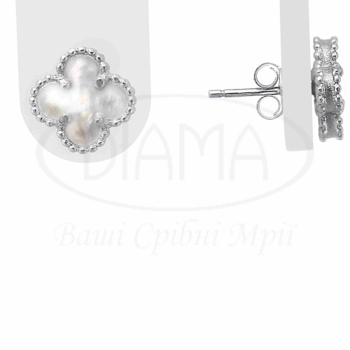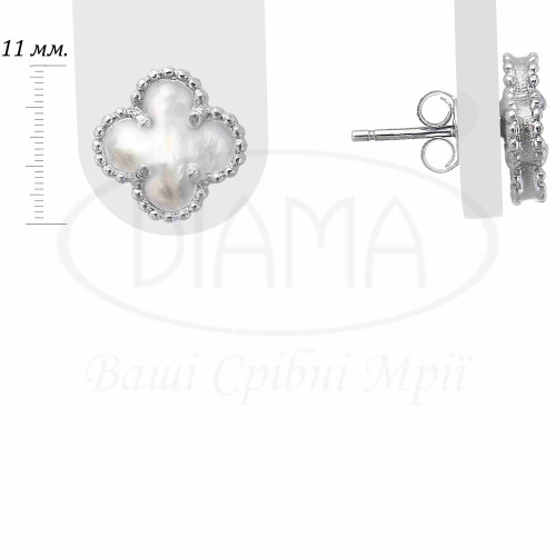 Срібні сережки пусети з Перламутром. Срібло 925 проби, покрите родієм. Виготовлені в формі Конюшини. Розмір головного елементу - 11-12 мм.