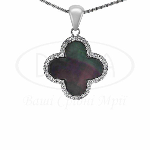 Підвіс срібний з чорним Перламутром та білим цирконом. Срібло 925 проби, покрите родієм. Виготовлений в формі Клевер. Розмір головного елементу - 20 мм.