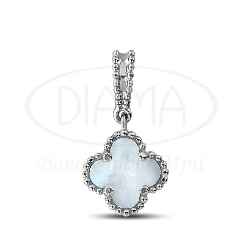 Підвіска срібна з білим перламутром. Срібло 925 проби, покрите родієм. Підвіска виготовлена в формі "Клевер". В наборі присутні каблучка, сережки та підвіс. Розмір головного елементу 11 мм.