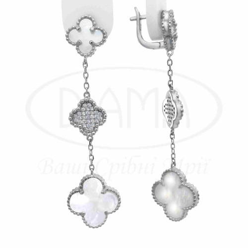 Срібні сережки з білим перламутром та цирконом. Срібло 925 проби, покрите родієм. В наборі є Сережки, Кольє та Браслет. Розмір головних елементів 11 та 15 мм.