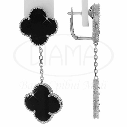 Срібні сережки з Оніксом. Срібло 925 проби, покрите родієм. Сережки виготовлена в формі "Чотирилисник". Розмір головного елементу сережки 18х20 мм.