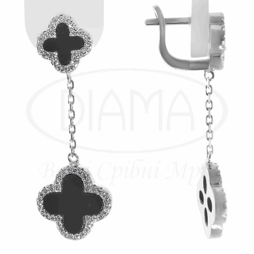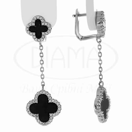 Сережки срібні з оніксом та білим цирконом. Срібло 925 проби, покрите родієм. Сережки виготовлені в формі "Клевер". В наборі присутні каблучка, кольє, сережки, підвіс та браслет. Розмір головних елементів - 14 мм та 10 мм.