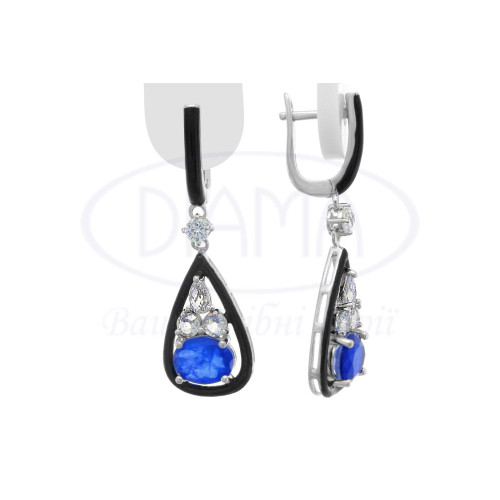 Срібні сережки з синім та білим цирконом, а також чорною емаллю. Срібло 925 проби, покрите родієм. В наборі присутні каблучка, сережки та підвіска.