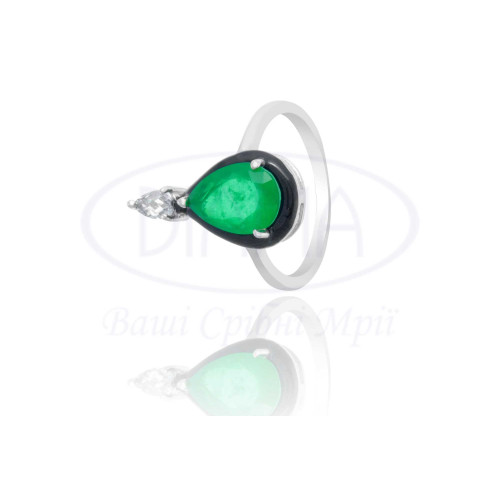Срібна каблучка з зеленим та білим цирконом, а також чорною емаллю у формі краплі. Срібло 925 проби, покрите родієм. В наборі присутні каблучка, сережки та підвіска.