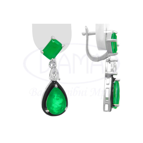 Срібнаі сережки з зеленим та білим цирконом, а також чорною емаллю у формі краплі. Срібло 925 проби, покрите родієм. В наборі присутні каблучка, сережки та підвіска.