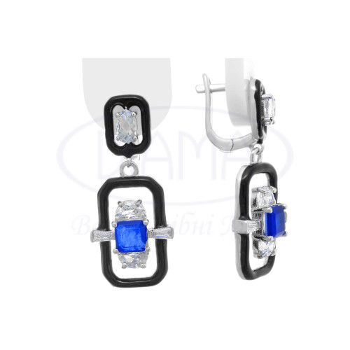 Срібні сережки з синім та білим цирконом, а також чорною емаллю у формі прямокутника. Срібло 925 проби, покрите родієм. В наборі присутні каблучка, сережки та підвіска.