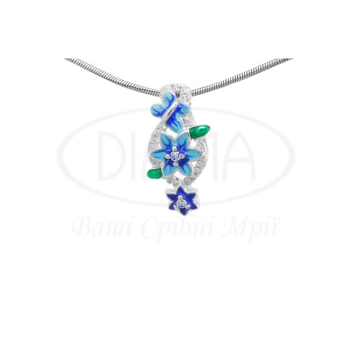 Підвіска срібна з квітами покритими блакитною емаллю та білим цирконом. Срібло 925 проби, покрите родієм. В наборі присутні також сережки та каблучка.