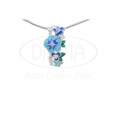 Підвіска срібна з квітами покритими блакитною емаллю та білим цирконом. Срібло 925 проби, покрите родієм. В наборі присутні також сережки та підвіска.