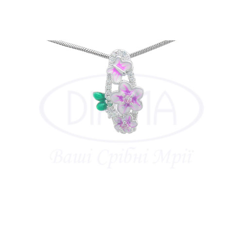 Підвіска срібна з квітами покритими рожевою емаллю та білим цирконом. Срібло 925 проби, покрите родієм. В наборі присутні також сережки та підвіска.