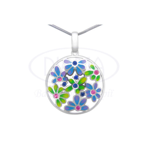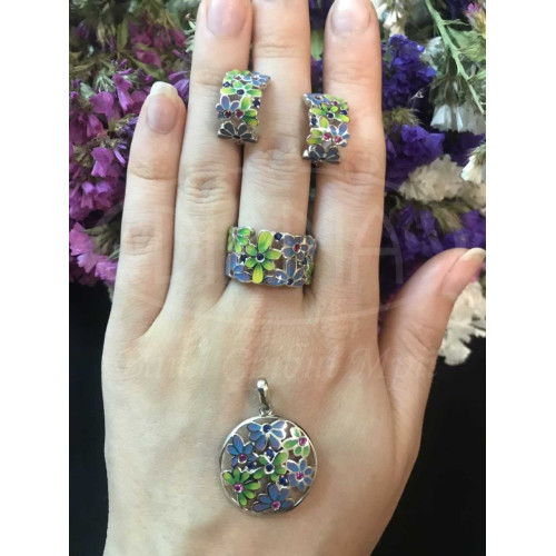 Срібна підвіска з кольоровою емаллю та різнокольоровим цирконом. Срібло 925 проби, покрите родієм. В комплекті каблучка, сережки та підвіска.