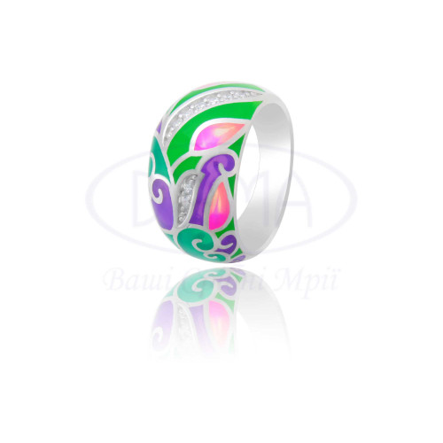 Срібна каблучка з кольоровою емаллю та білим цирконом. Срібло 925 проби, покрите родієм. Ширина каблучки 12 мм. В наборі є каблучка, сережки та підвіска.