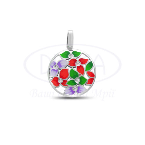 Срібна підвіска з кольоровою емаллю у формі квітів та білим цирконом. Срібло 925 проби, покрите родієм. Діаметр підвіски 23 мм. В комплекті каблучка, сережки та підвіска.