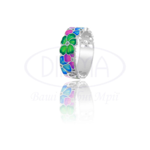 Срібна каблучка з кольоровою емаллю із зображенням квітів та білим цирконом. Срібло 925 проби, покрите родієм. Ширина каблучки 7 мм. В комплекті каблучка, сережки та підвіска.