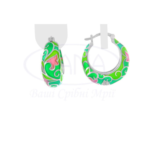 Срібні сережки з кольоровою емаллю із зображенням квітів та білим цирконом. Срібло 925 проби, покрите родієм. Ширина Сережки 9 мм. діаметр 20 мм. В наборі є каблучка, сережки та підвіска.