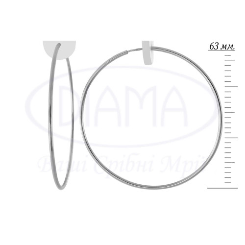 Срібні сережки кільця у формі круга. Срібло 925 проби, покрите родієм. Діаметр сережки 62 мм. товщина сережки 2 мм.