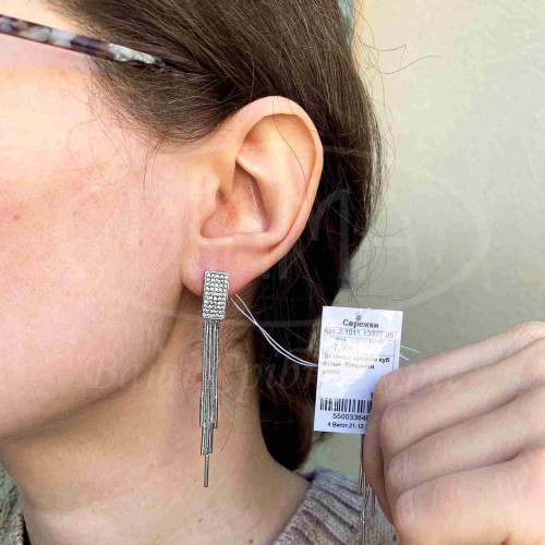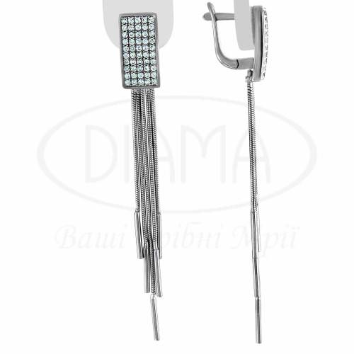 Сережки срібні з білим цирконом у формі прямокутника. Срібло 925 проби, покрите родієм. Висота сережки 68 мм. Розмір головного елементу сережки (прямокутник ) 7,5х15 мм.