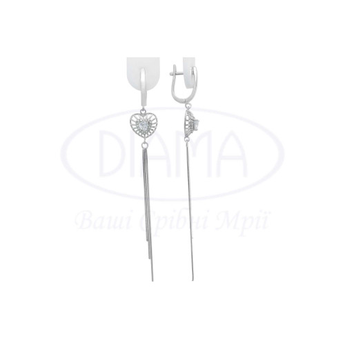 Срібні сережки з серцем та білим цирконом. Срібло 925 проби, покрите родієм.