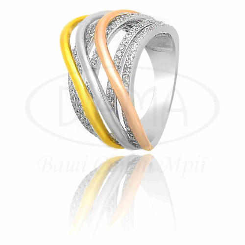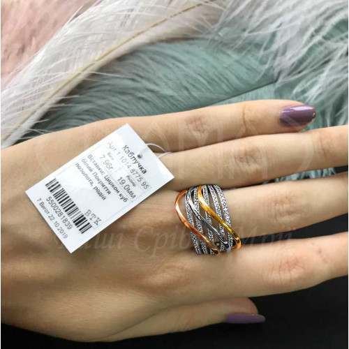 Каблучка срібна з позолотою та білим цирконм. Срібло 925 проби, покрите родієм, а також жовтою та червоною позолотою.