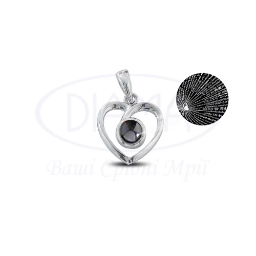Підвіска срібна у формі серця з білим цирконом. Срібло 925 проби, покрите родієм. Якщо посвітити ліхтариком через камінь, то Ви побачите надпис "I LOVE YOU" на 100 мовах світу. Розмір підвіски 15 мм.