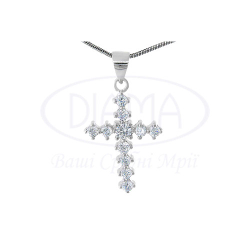 Хрестик зі срібла 925 проби з камінцями білого циркону, покритий родієм. Розмір 23,5×17 мм, ширина 4 мм