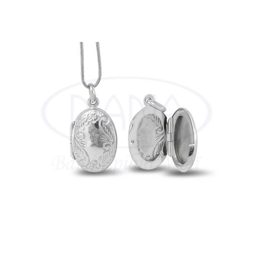 Підвіска срібна для фотографії овальної форми з візерунками. Особливість цієї прикраси в тому, що вона складається з двох частин, поєднаних між собою механізмом, завдяки якому підвіска відкривається. Срібло 925 проби, покрите родієм. Діаметр - 21× 15,5 мм, товщина - 5мм