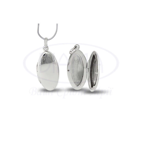 Підвіска срібна для фотографії овальної форми. Особливість цієї прикраси в тому, що вона складається з двох частин, поєднаних між собою механізмом, завдяки якому підвіска відкривається. Срібло 925 проби, покрите родієм. Діаметр - 26× 15 мм, товщина - 5 мм
