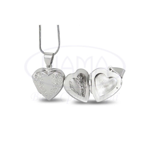 Підвіска срібна для фотографії у формі серця з візерунками. Особливість цієї прикраси в тому, що вона складається з двох частин, поєднаних між собою механізмом, завдяки якому підвіска відкривається. Срібло 925 проби, покрите родієм. Діаметр - 19× 20 мм, товщина - 6,5 мм