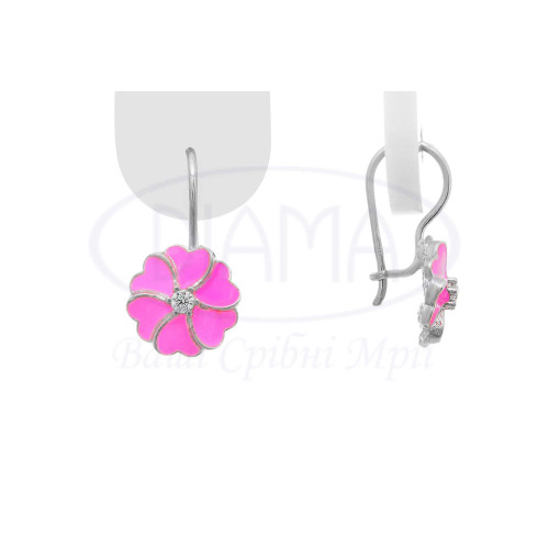 Сережки срібні дитячі з рожевою емаллю та білим цирконом. Срібло 925 проби, покрите родієм. В комплекті каблучка, підвіска та сережки.