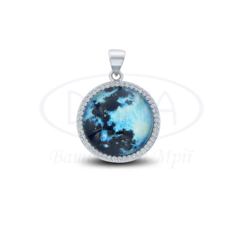 Підвіска срібна з ювелірним склом, що світиться в темряві, а також з білим цирконом. Срібло 925 проби, покрите родієм. Розмір головного елементу 21 мм. У комплекті кольє та підвіска.