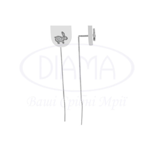 Сережки срібні у формі палички та кролика з білим цирконом, які з'єднані між собою ланцюгом. Срібло 925 проби, покрите родієм. Висота палички 19 мм, а розмір кролика 8х9 мм.