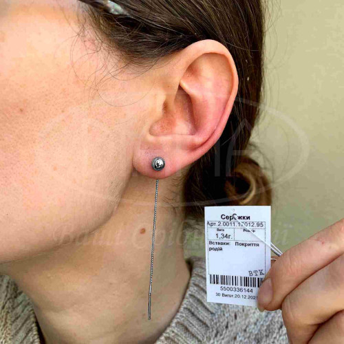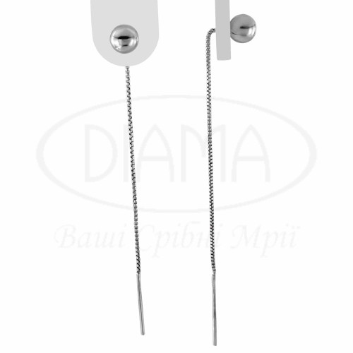 Сережки-протяжки срібні у формі палички та кулькою які з'єднані між собою ланцюгом. Срібло 925 проби, покрите родієм. Висота палички 2 см, а діаметр кульки 6 мм, довжина ланцюга 6 см.