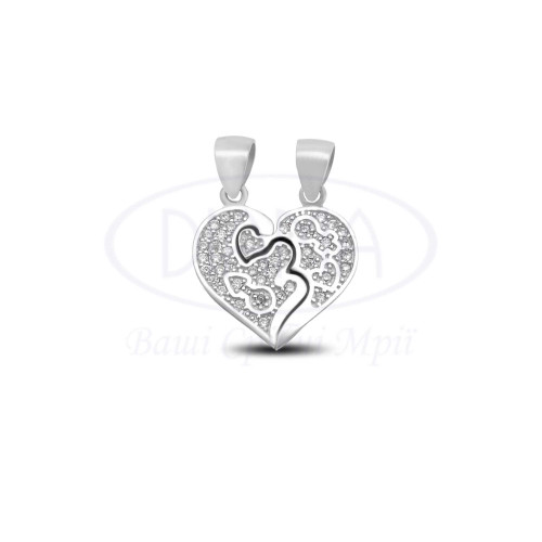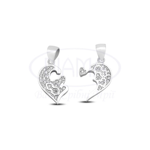 Підвіска срібна з білим цирконом, яка складається з двох окремих частинок, які зˊєднуючись утворюють серце. Срібло 925 проби, покрите родієм.
