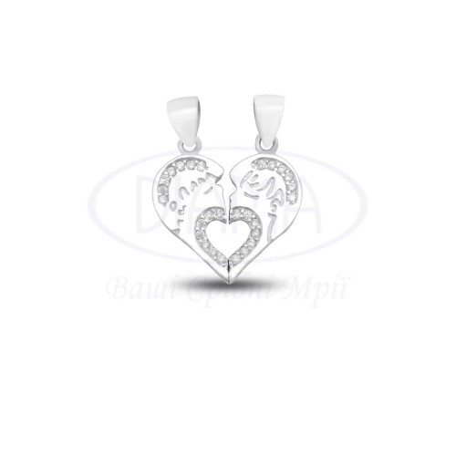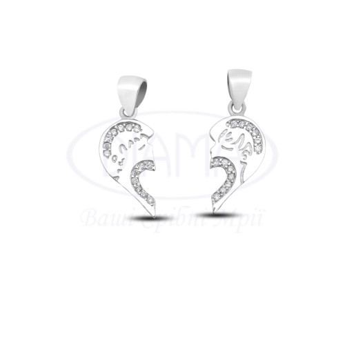 Підвіска срібна з білим цирконом, яка складається з двох окремих частинок у вигляді закоханої пари, які зˊєднуючись утворюють серце. Срібло 925 проби, покрите родієм. Ширина підвіски 20 мм. висота 20 мм.