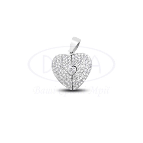 Підвіска срібна у формі серця з камінцями білого циркону, яке розˊєднується та відкриває друге сердечко, на яке Ви можете нанести гравіювання. Срібло 925 проби, покрите родієм.