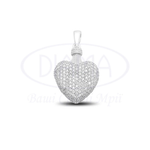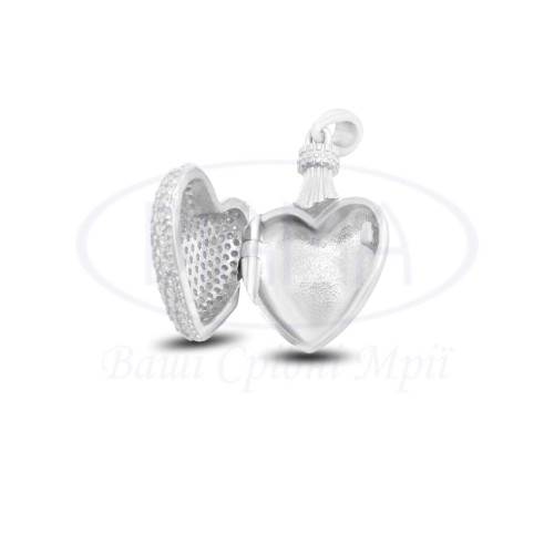 Срібна підвіска що відкривається, виконана у формі серця з білим цирконом, яке розˊєднується та відкриває друге сердечко, на яке Ви можете нанести гравіювання. Срібло 925 проби, покрите родієм. В комплекті є кольє та підвіска.