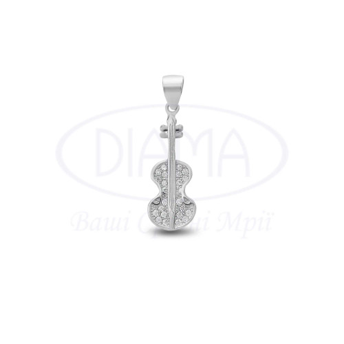 Срібна підвіска у формі скрипки з білим цирконом. Срібло 925 проби, покрите родієм. Розмір підвіски 9х25 мм.
