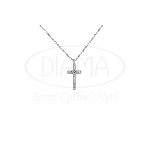 Кольє срібне з білим цирконом у формі хрестика. Срібло 925 проби, покрите родієм. Розмір головного елементу 22х10 мм.
