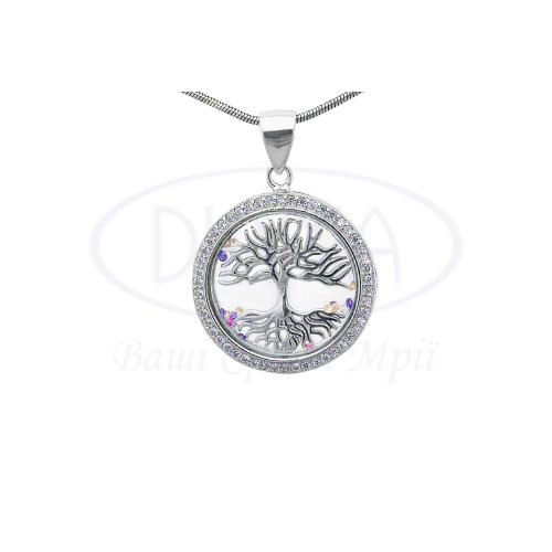 Підвіска срібна у формі кола, в середині якого (під склом) розміщене дерево з різнокольоровим цирконом. Срібло 925 проби, покрите родієм. Розмір підвіски 20мм