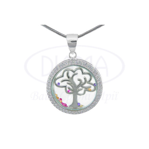 Підвіска срібна у формі кола, закритого з обох боків склом, а в середині дерево та різнокольорові камінці циркону. Срібло 925 проби, покрите родієм. Розмір підвіски 20мм
